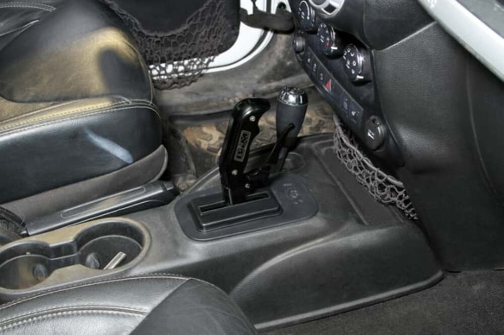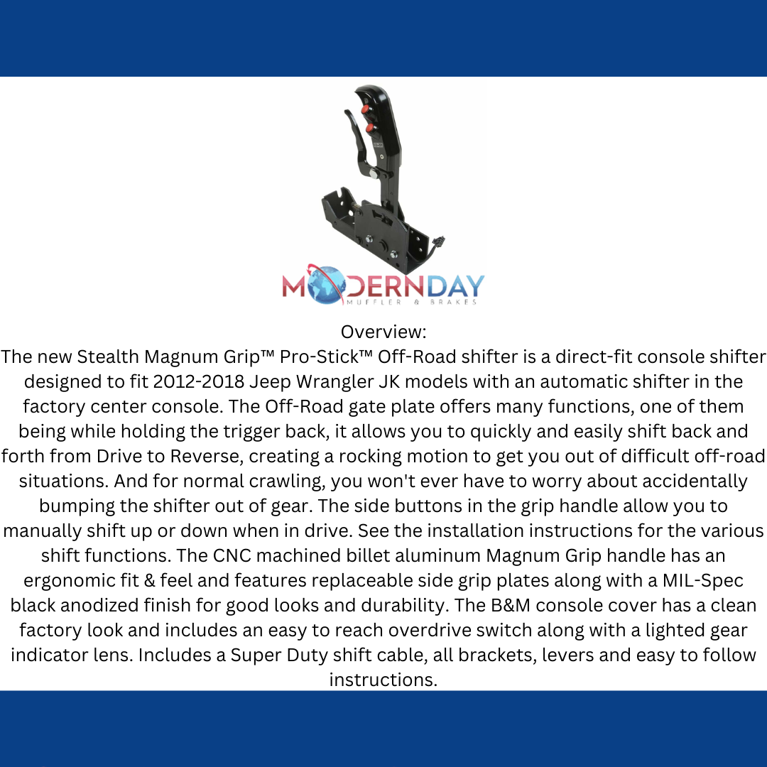 The new Stealth Magnum Grip™ Pro-Stick™ Off-Road shifter is a direct-fit console shifter designed to fit 2012-2018 Jeep Wrangler JK models with an automatic shifter in the factory center console. The Off-Road gate plate offers many functions, one of them being while holding the trigger back, it allows you to quickly and easily shift back and forth from Drive to Reverse, creating a rocking motion to get you out of difficult off-road situations. And for normal crawling, you won't ever have to worry about accidentally bumping the shifter out of gear. The side buttons in the grip handle allow you to manually shift up or down when in drive. See the installation instructions for the various shift functions. The CNC machined billet aluminum Magnum Grip handle has an ergonomic fit & feel and features replaceable side grip plates along with a MIL-Spec black anodized finish for good looks and durability. The B&M console cover has a clean factory look and includes an easy to reach overdrive switch along with a lighted gear indicator lens. Includes a Super Duty shift cable, all brackets, levers and easy to follow instructions.
