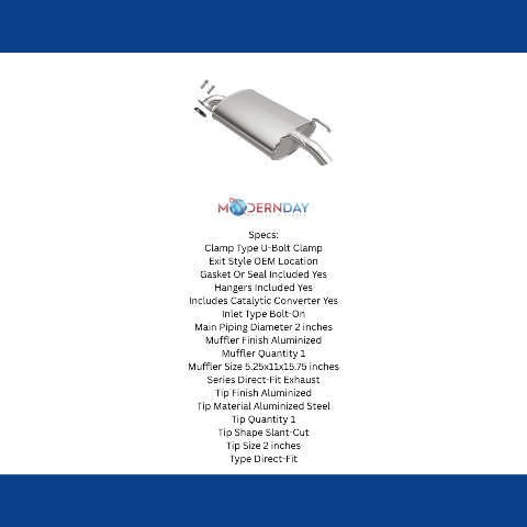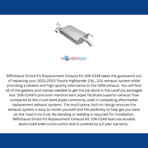 BRExhaust Direct-Fit Replacement Exhaust Kit 106-0149 takes the guesswork out of replacing your 2001-2003 Toyota Highlander 2.4L, 3.0L exhaust system while providing a reliable and high-quality alternative to the OEM exhaust. You will find all of the gaskets and clamps needed to get the job done in the carefully packaged box. 106-0149?s precision mandrel bent pipes facilitate superior exhaust flow compared to the crush-bent pipes commonly used in competing aftermarket replacement exhaust systems. The multi-piece, bolt-on design ensures the exhaust system is easy to install yourself and fits perfectly to help get you back on the road in no time. No bending or welding is required for installation. BRExhaust Direct-Fit Replacement Exhaust Kit 106-0149 features durable aluminized steel construction and is covered by a 2 year warranty. BRExhaust 106-0149 is engineered for OEM 1744020180, 1744028030 exhaust replacement.