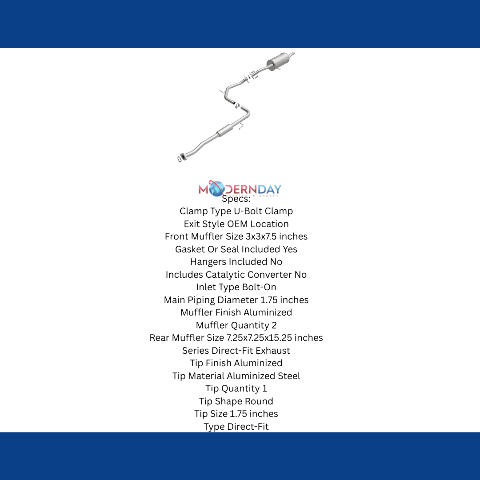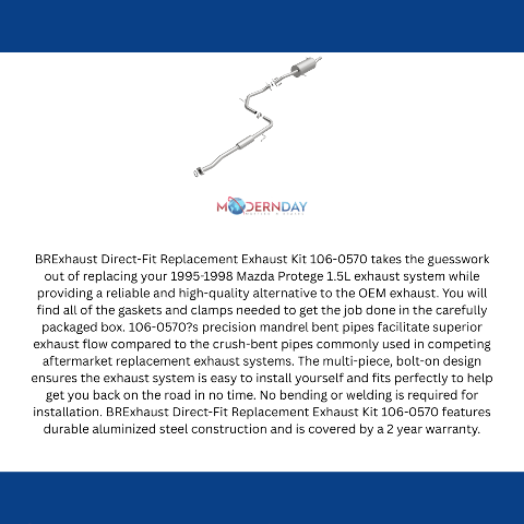 BRExhaust Direct-Fit Replacement Exhaust Kit 106-0585 takes the guesswork out of replacing your exhaust system while providing a reliable and high-quality alternative to the OEM exhaust. You will find all of the gaskets and clamps needed to get the job done in the carefully packaged box. 106-0585’s precision mandrel bent pipes facilitate superior exhaust flow compared to the crush-bent pipes commonly used in competing aftermarket replacement exhaust systems. The multi-piece, bolt-on design ensures the exhaust system is easy to install yourself and fits perfectly to help get you back on the road in no time. No bending or welding is required for installation. This Direct-Fit Exhaust System Kit is designed to fit the 2003-2007 Honda Accord 2.4L. BRExhaust Direct-Fit Replacement Exhaust Kit 106-0585 includes (1) Ring Gasket, (2) 1.75in. U-Bolt Clamps, (3) Bolts, (3) Nuts and interchanges with OE parts 18030-SDN-A00, 18030-SDN-A01, 18030-SDN-A10. BRExhaust Direct-Fit Replacement Exhaust Kit 106-0585 features durable Aluminized Steel construction and is covered by a 2 year warranty.