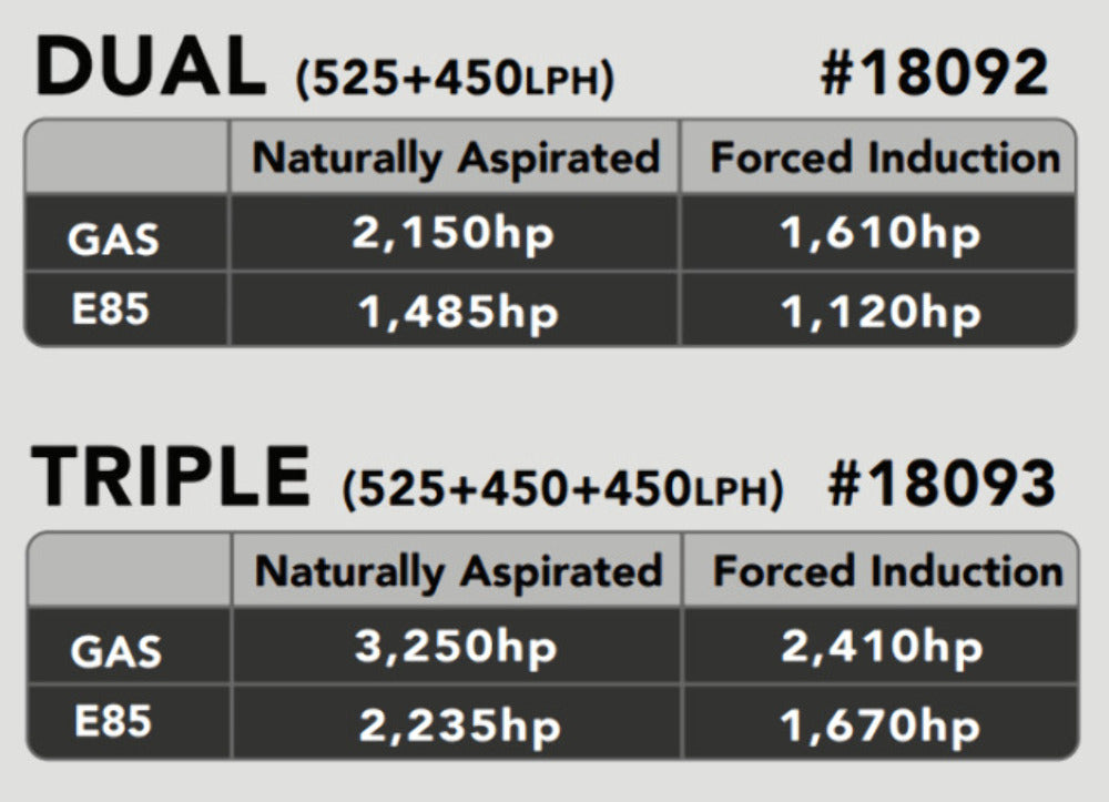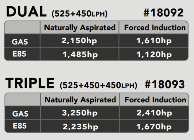 Fuel Pump, Dual Phantom, 1x 525/1x 450 Direct Drop-In, Mopar Charger/Challenger Hellcat. Gasoline / e85 compatible. Can be PWM to pressure or return style with bypass regulator and return line. Requires AN lines and high-flow filtration.