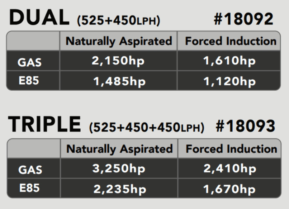 Fuel Pump, Dual Phantom, 1x 525/2x 450 Direct Drop-In, Mopar Charger/Challenger Hellcat. Gasoline / e85 compatible. Can be PWM to pressure or return style with bypass regulator and return line. Requires AN lines and high-flow filtration.