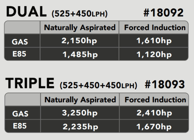 Fuel Pump, Dual Phantom, 2x 525 Direct Drop-In, Mopar Charger/Challenger Hellcat. Gasoline / e85 compatible. Can be PWM to pressure or return style with bypass regulator and return line. Requires AN lines and high-flow filtration.
