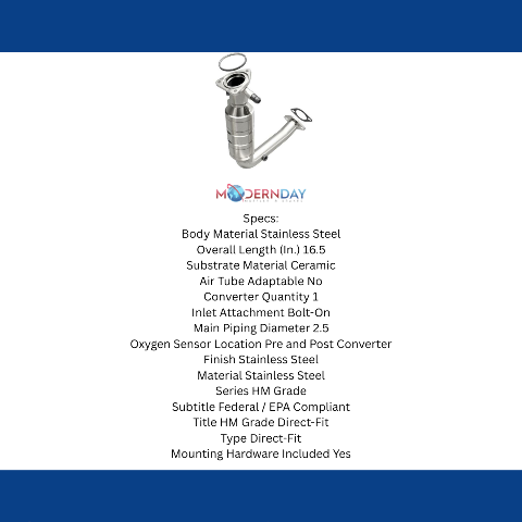 MagnaFlow HM Grade Federal/EPA Compliant Direct-Fit Catalytic Converter 25201 helps keep the check engine light off. DIY installation is easy with the proper tools (no cutting or welding required). With features including mandrel-bent tubing to eliminate flow restrictions and stainless steel construction to resist corrosion, you can have confidence in the quality of this catalytic converter. Using state-of-the-art 3D scanning systems in the design process, the MagnaFlow metrology department ensures this new part to fit and function like the original equipment.